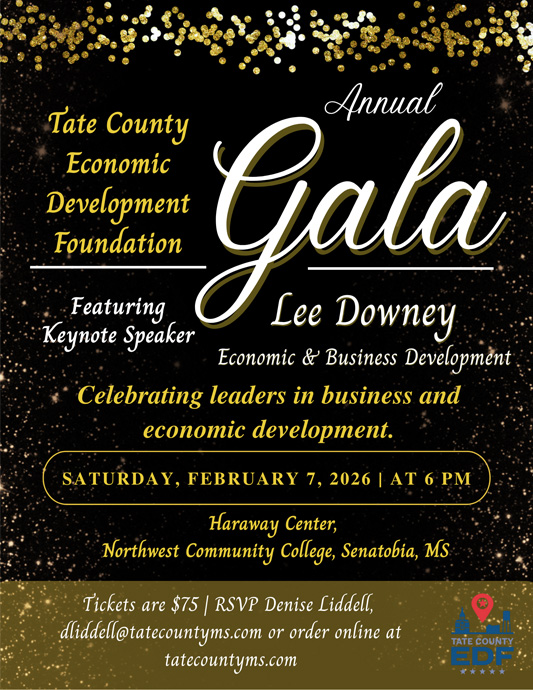 Tate County Economic Development Foundation Annual Gala will be held on Saturday, February 7, 2026, at 6:00 PM at the Haraway Center, Northwest Community College in Senatobia.